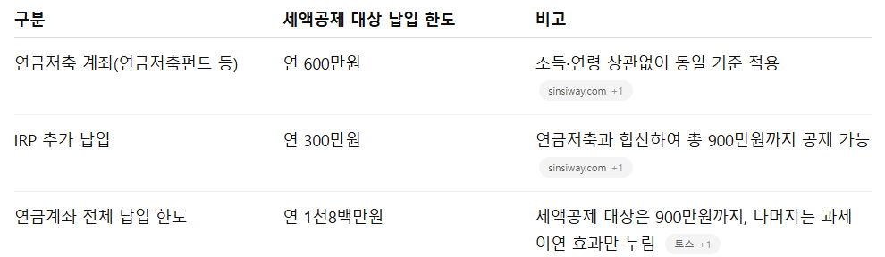 현재 기준으로 연금계좌에서 세액공제를 받을 수 있는 한도는 한 해 최대 900만 원입니다.